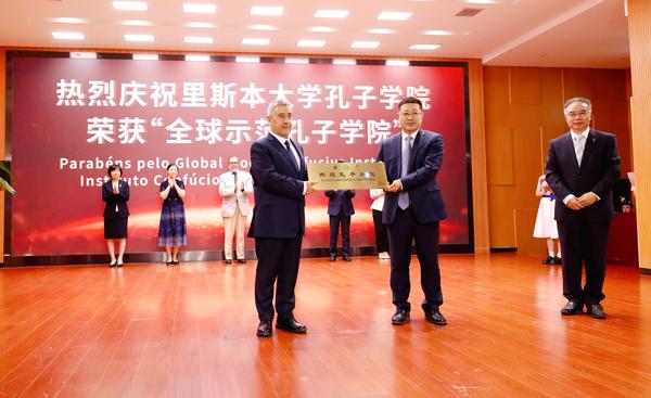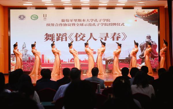 仪式上,赵灵山、路易斯·费雷拉、陈法春续签了三方合作共建里斯本大学孔子学院协议。赵灵山在现场为里斯本大学“全球示范孔子学院”授牌,里斯本大学孔子学院葡方院长若昂·巴雷罗、中方院长王锦程接牌。与会人员一同观看了中国古典舞蹈《佼人寻春》。