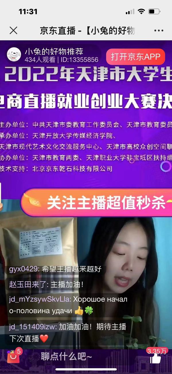 大赛历时2个多月,分为初赛及决赛两个阶段,初赛吸引了近3000余名学生报名参加,共收到参赛作品1.2万余条,总播放量4000万次;复赛共有170支团队在京东直播平台进行直播比赛,直播商品由市教育两委和天津职业大学驻宝坻区扶持组精心挑选,累计吸引了超10万名观众参与,点赞量过百万,一个半小时内销售近2000单。