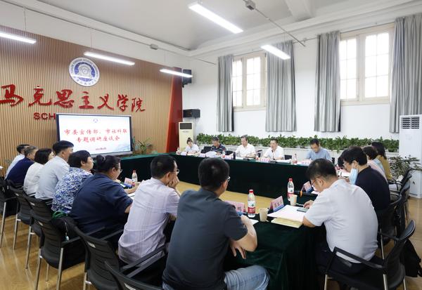 下午,市委宣传部理论处(市社科工作办)、市社科联智库工作部就天津市中国特色社会主义理论体系研究中心基地、马克思主义学院及智库建设情况进行专题调研。我校马克思主义学院、科研处和相关智库负责人围绕基地建设管理、马克思主义学院建设、思政课教育教学、社科服务管理、智库建设情况等作了充分交流,提出了意见建议。