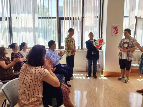 在“开放日”活动期间,教师们不仅为前来咨询的各界人士介绍了新学期的课程安排,还开展了书法、茶艺、剪纸等文化体验活动,以增进来宾对中国文化的了解。现场展出了由里斯本安东尼奥艺术学校学生创作的40余幅中国剪纸作品。这些作品全部是在孔院社会班学员索菲亚精心指导下完成的,体现了学生们对中国文化内涵的深刻理解。里斯本安东尼奥艺术学校负责人在开展仪式上表示,感谢孔子学院为学生的剪纸作品提供了难得的展出机会,这对学生们是一种莫大的鼓励,希望孔子学院能继续为学生学习中国文化提供支持。活动期间,还举行了2022-2023学年社会班结业仪式。中外方院长为80余名学员颁发了结业证书。