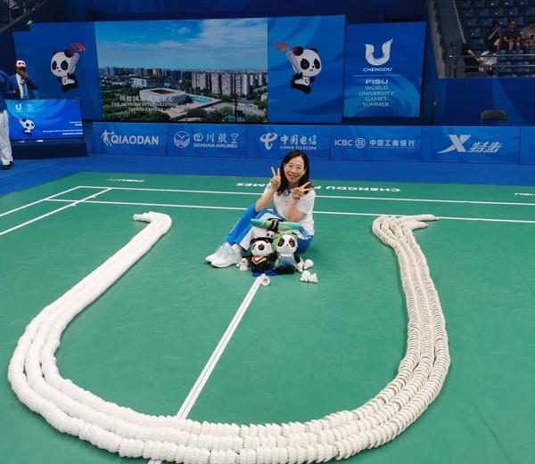 羽毛球摆出大运会会标“U”型,董媛与吉祥物“蓉宝”合影