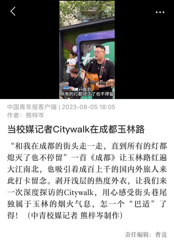 中国青年报客户端刊发熊梓岑制作的推文“当校媒记者Citywalk在成都玉林路”