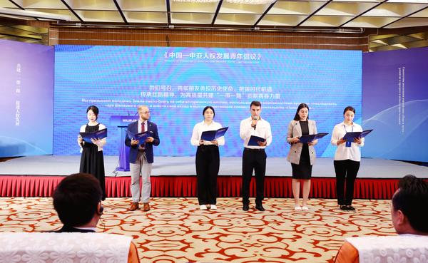 我校留学生小波与青年代表共同宣读《中国—中亚人权发展青年倡议》