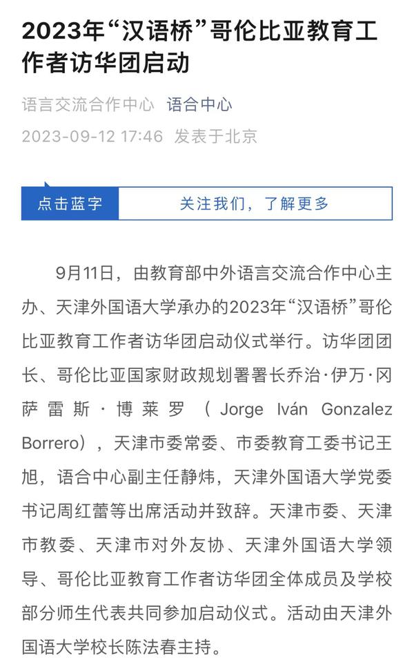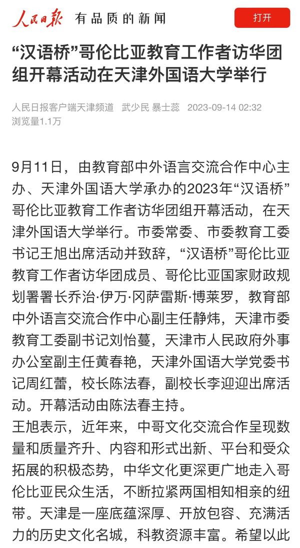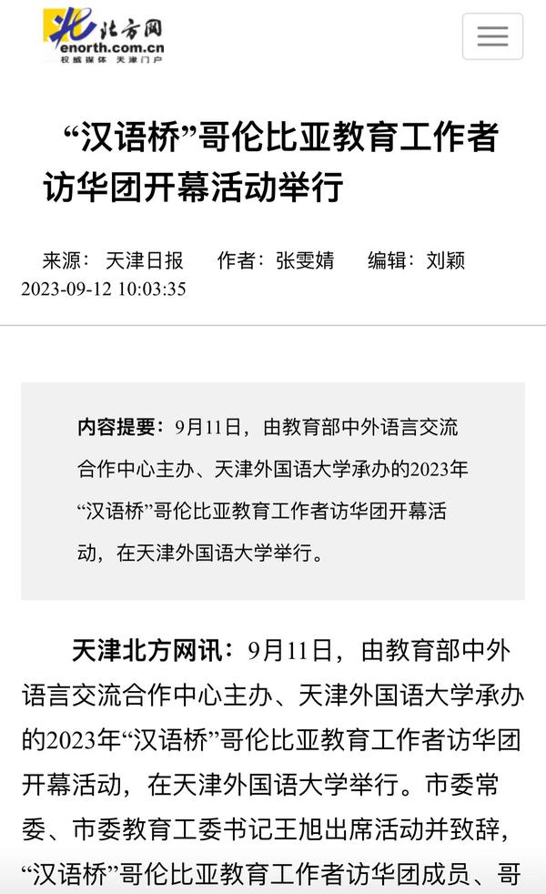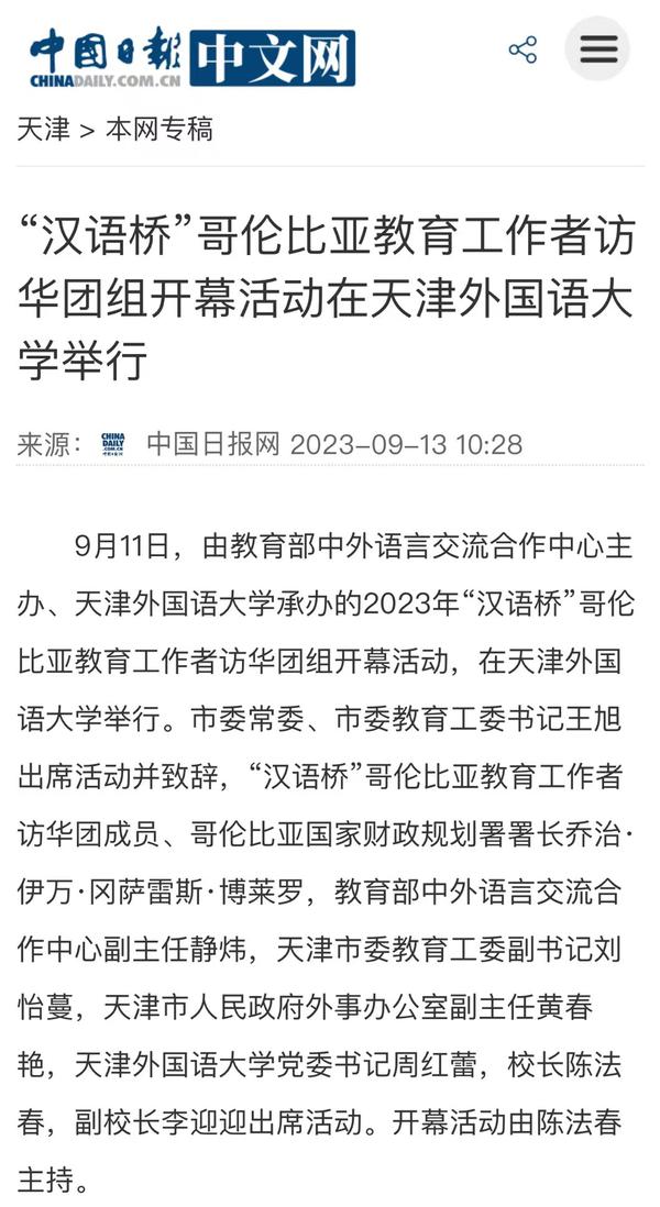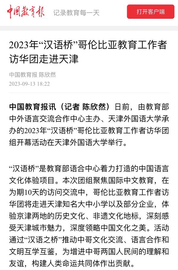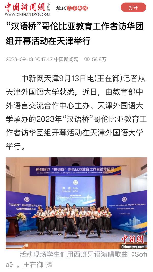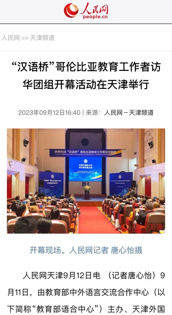 9月11日,由教育部中外语言交流合作中心主办、开云登陆入口承办的2023年“汉语桥”哥伦比亚教育工作者访华团组开幕活动在我校举行。本次团组聚焦国际中文教育,在为期10天的访问交流中,哥伦比亚教育工作者访华团将深刻感受天津城市魅力,深度领略中国文化之美。人民日报客户端、人民网、中国新闻网、中国日报网、中国教育报客户端、教育部语合中心微信公众号、北方网等多家媒体对此进行了报道。