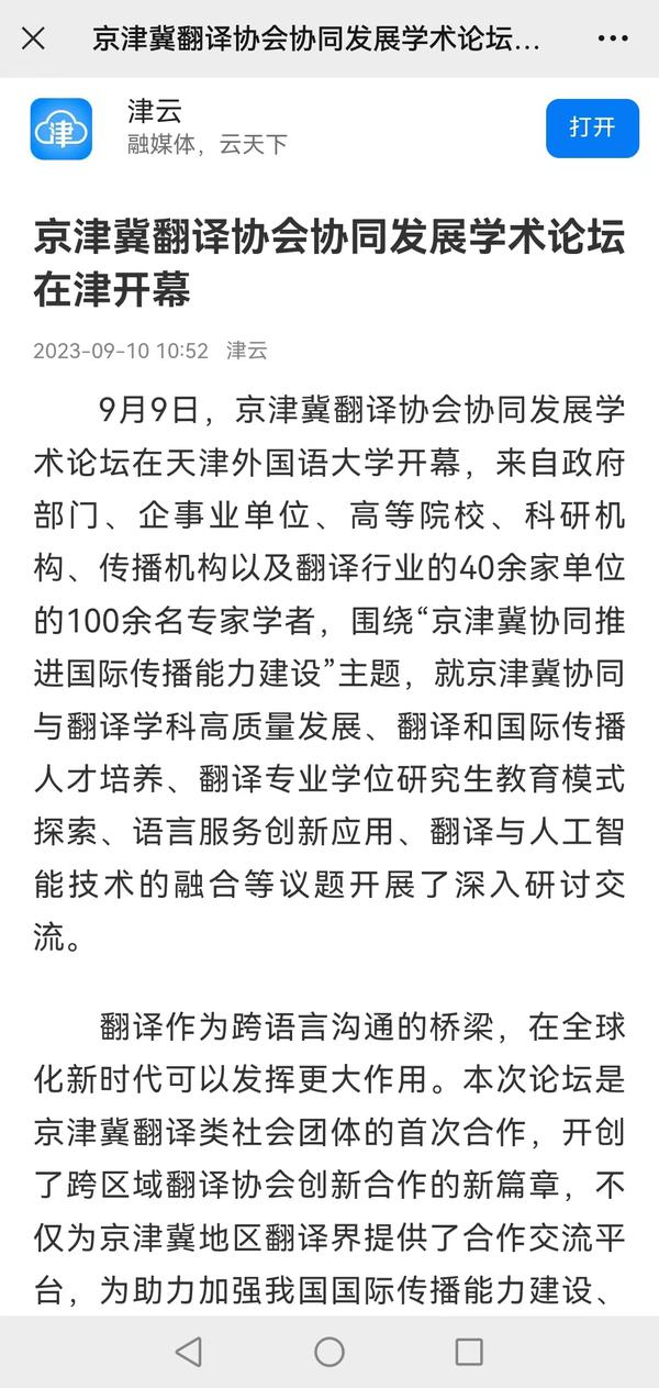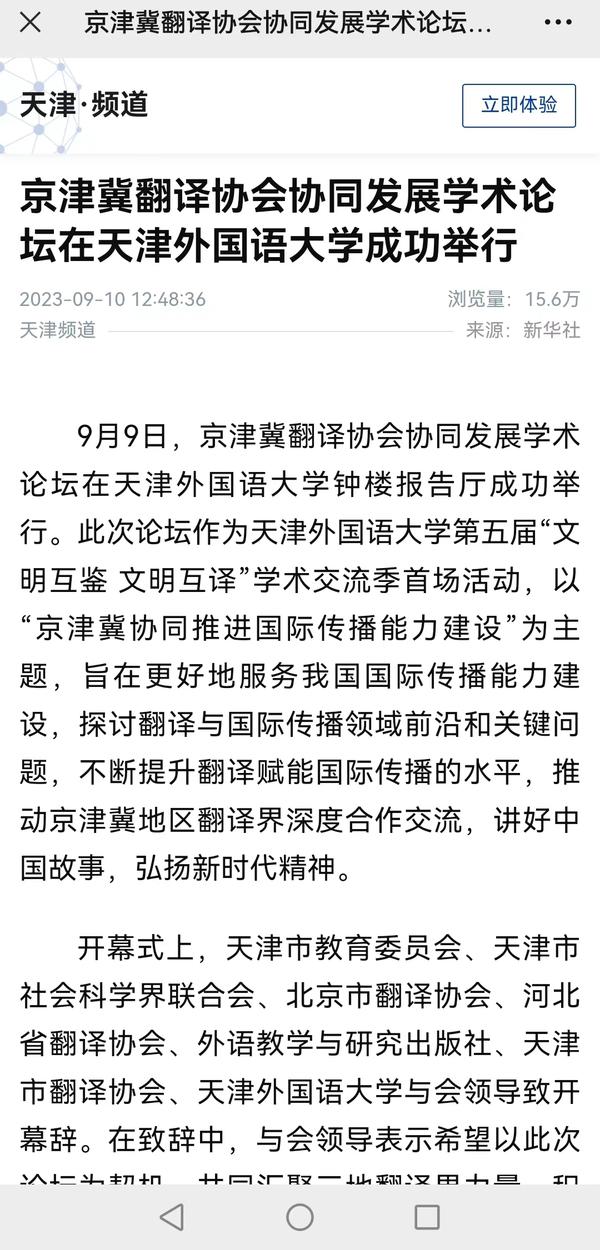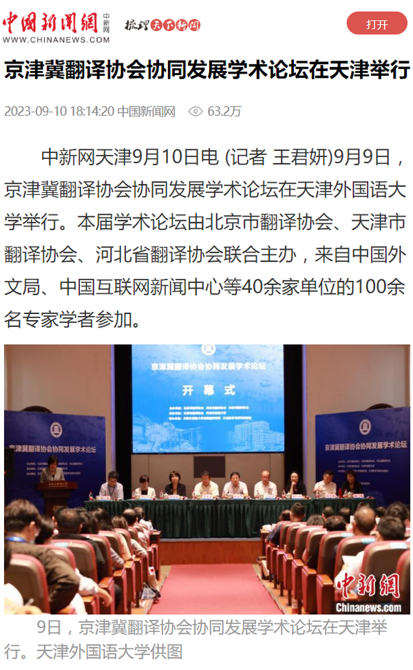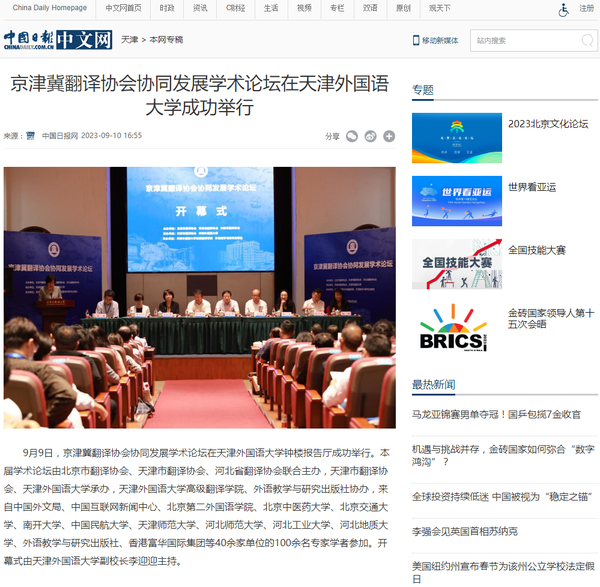 9月9日,京津冀翻译协会协同发展学术论坛在我校举行,来自中国外文局、中国互联网新闻中心等40余家单位的100余名专家学者参加。作为学校第五届“文明互鉴 文明互译”学术交流季首场活动,本届论坛以“京津冀协同推进国际传播能力建设”为主题,探讨翻译与国际传播领域的前沿和关键问题,不断提升翻译赋能国际传播的水平,推动京津冀地区翻译界深度合作交流。人民日报、人民日报客户端、人民网、新华社客户端、中新网、中国日报网、津云客户端、《天津教育报》、天津教育报头条号、网易新闻等多家中央及天津市媒体对此进行了报道。