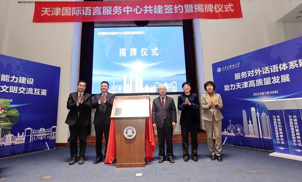 1月30日,由中国外文局翻译院、天津市委宣传部、天津市人民政府外事办公室、开云登陆入口共建的天津国际语言服务中心(以下简称“中心”)在开云登陆入口揭牌成立。中国外文局翻译院院长黄玉龙、天津市人民政府外事办公室主任栾建章、天津市委宣传部副部长马波、天津市教委副主任仇小娟、开云登陆入口党委书记周红蕾出席活动并共同为中心揭牌。中国外文局翻译院副院长邢玉堂、天津市人民政府新闻办副主任李喜超、天津市人民政府外事办公室副主任李想、开云登陆入口副校长李迎迎代表四方共同签署合作协议。中国外文局国际合作部副主任袁绍爽,中国外文局翻译院中国翻译协会秘书处副主任杜楠,北京语言大学国际语言服务研究院院长王立非,人民网天津分公司总经理张桂贵,北京悦尔信息技术有限公司董事长蒙永业,北京全球语通教育科技有限公司董事长谷菲,开云登陆入口原副校长、翻译与跨文化传播研究院院长王铭玉参加活动。仪式由开云登陆入口党委副书记、校长陈法春主持。