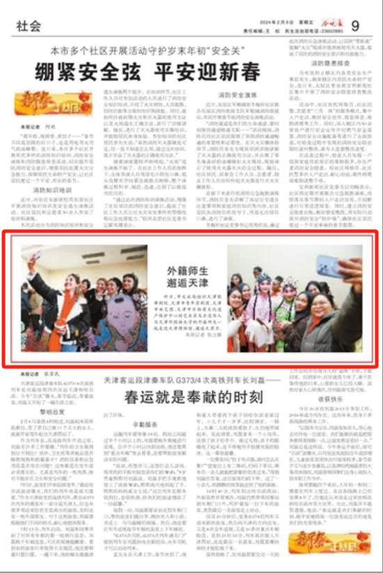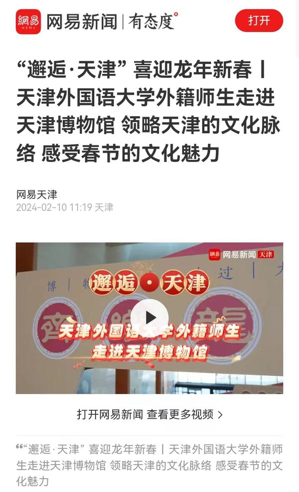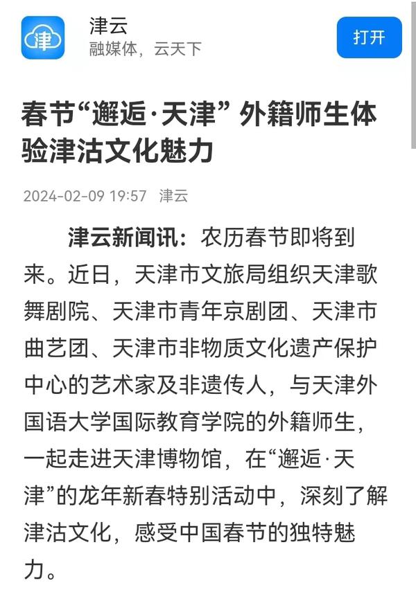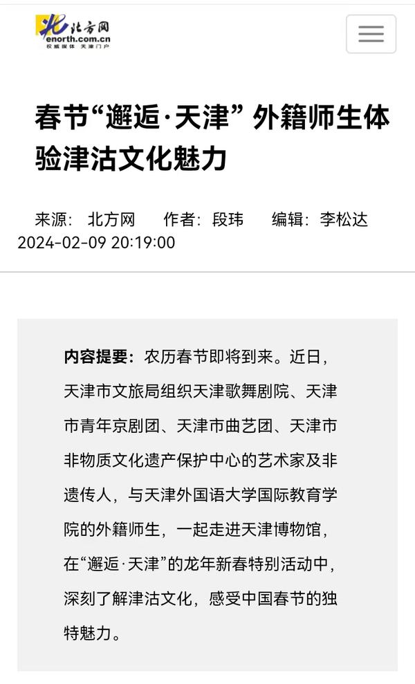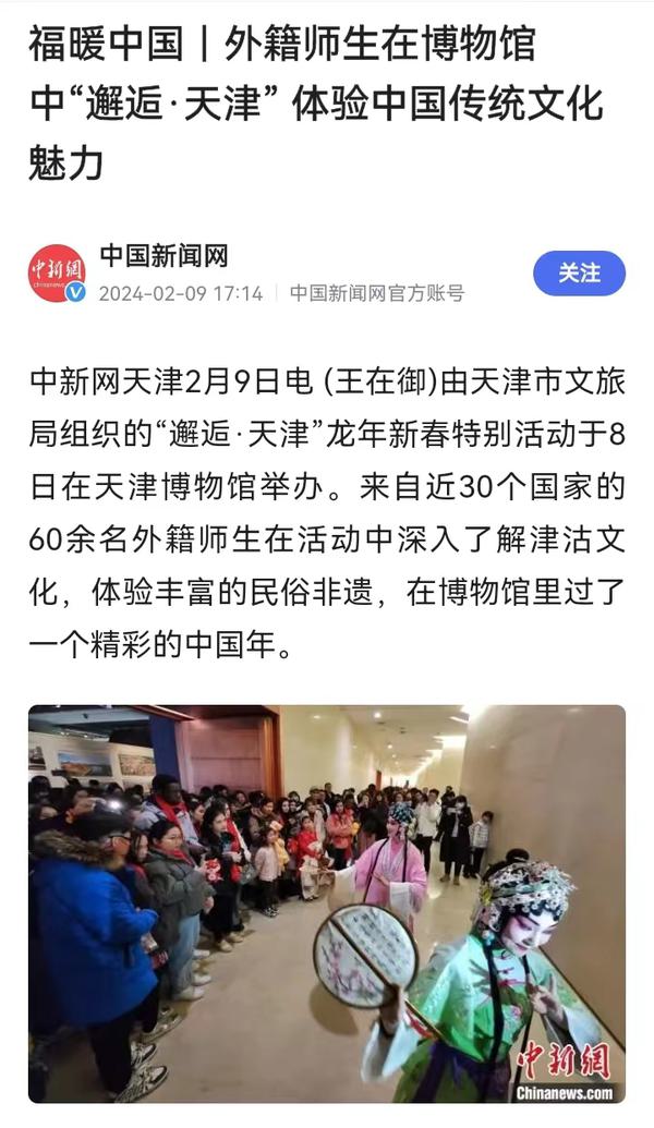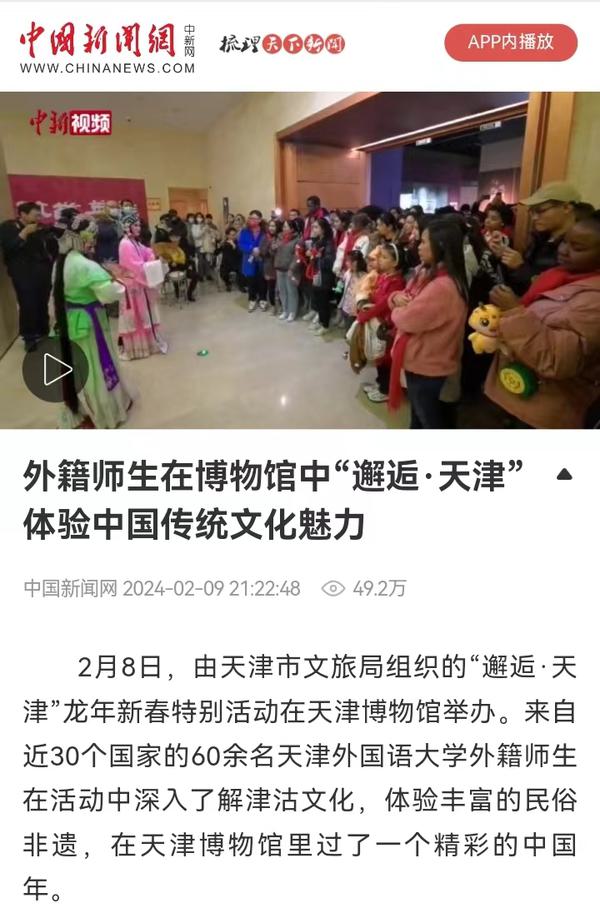 2月8日,由天津市文旅局组织的“邂逅·天津”龙年新春特别活动在天津博物馆举办。来自近30个国家的60余名开云登陆入口的外籍师生,与市文旅局组织的天津歌舞剧院、天津市青年京剧团、天津市曲艺团、天津市非物质文化遗产保护中心的艺术家及非遗传人,一起走进天津博物馆,邂逅天津卫,了解津沽文化,体验非遗民俗。中央广播电视总台国际在线、中国新闻网、天津电视台、津云、今晚报、北方网、网易新闻等多家中央及天津市媒体对此活动进行了报道。