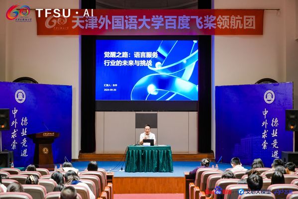 此次活动包括“AI MeetUp 沙龙”“AI 知识竞赛”及“AI Day 市集”三大板块。在“AI MeetUp 沙龙”中,百度飞桨教育生态运营负责人钱芳与百度AI技术生态产品运营经理丁进受邀进行人工智能与翻译讲座。天外高级翻译学院党委书记郭芃,副书记王瑾,全院师生参加了活动。讲座由学院专业教师朱华主持。