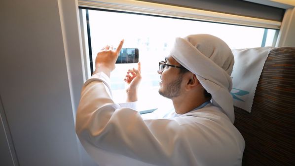 4月7日,从北京开往天津站的高铁上,一名阿联酋学生用手机拍摄窗外风景。新华社记者 胡震泽 摄