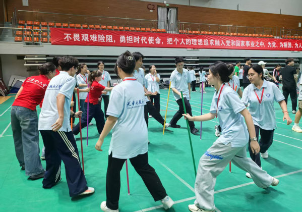 一场别开生面的素质拓展活动在天津师范大学体育馆火热展开。学员们放下书本,全身心投入。在专业教练的指导下,“能量传递”“齐心协力”“击鼓颠球”“合力建塔”等精心设计的素拓活动轮番开展。汗水浸湿了衣衫,但笑容洋溢在每个人的脸上。活动中,天外学子展现出聪慧与韧劲,彼此鼓励,密切协作,一次次突破自我、团结一致,又好又快地完成各项任务,为赴疆实习支教奠定了团队合作的基础。