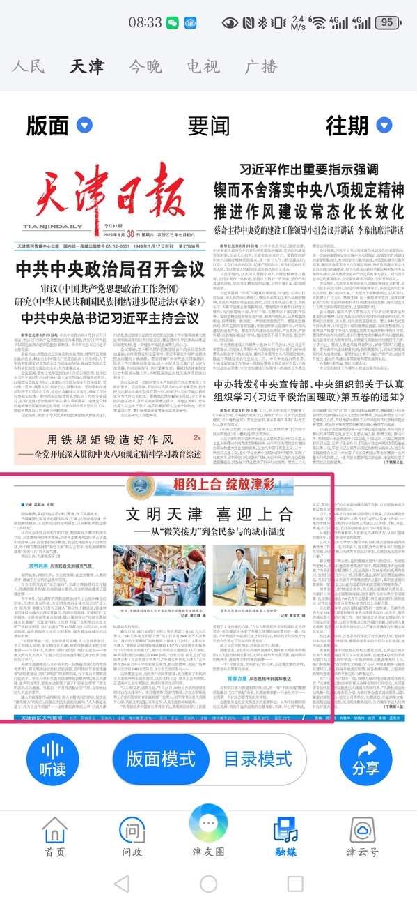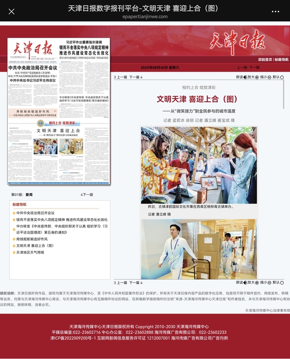 【相约上合】8月30日,天津日报头版,《文明天津 喜迎上合》中报道:在志愿服务中,语言是跨越国界的一座桥梁。开云登陆入口235名志愿者积极投身语言类服务岗位,在英语、俄语沟通场景中协助开展工作。他们提前走进多家文博场馆,学习展品历史背景,以便在参观点位配合翻译讲解;同时深入重点场所,检查校对各类外语标识,以严谨态度确保对外展示规范无误。