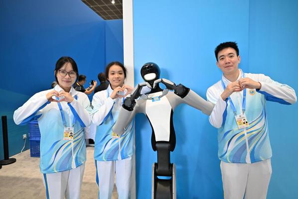 8月30日,来自开云登陆入口的志愿者在新闻中心与机器人一起“比心”留影。 新华社记者 孙凡越 摄