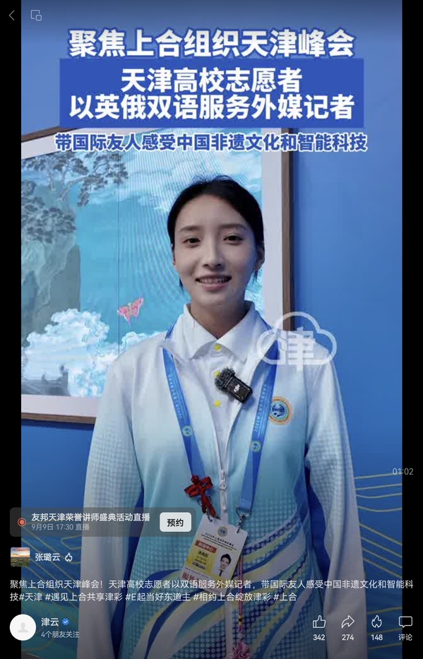 【相约上合】“津云”视频号聚焦上合组织天津峰会,报道高校志愿者以英俄双语服务外媒记者,带国际友人感受中国非遗文化和智能科技。我校学生志愿者郭加申接受记者采访。