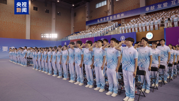 “我志愿服务上海合作组织天津峰会恪守奉献初心勇担时代使命……为天津增光为中国添彩以上合之约共襄文明未来”上岗仪式现场青年志愿者代表带领全体志愿者庄严宣誓998人的声音响彻全场