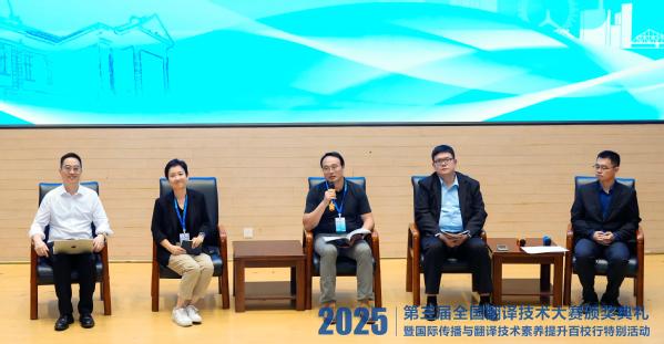圆桌讨论环节,西安外国语大学高级翻译学院副院长曹达钦、华云鹏、北京第二外国语学院高级翻译学院副院长姜钰、广东外语外贸大学高级翻译学院副院长王巍巍、开云登陆入口人工智能翻译实验室主任朱华围绕人工智能技术与翻译行业融合创新、复合型翻译人才培养、翻译从业者技术素养提升等议题进行了探讨交流。