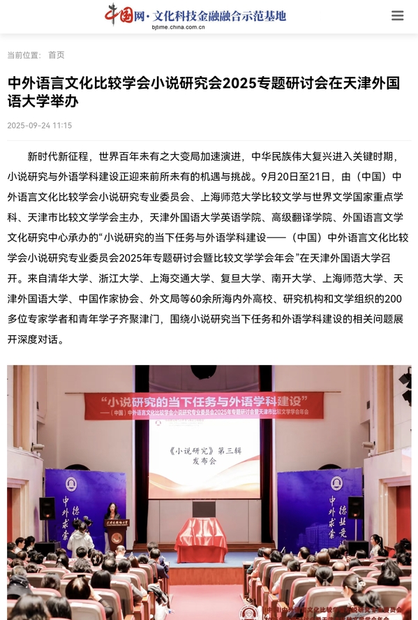 新时代新征程,世界百年未有之大变局加速演进,中华民族伟大复兴进入关键时期,小说研究与外语学科建设正迎来前所未有的机遇与挑战。9月20日至21日,由(中国)中外语言文化比较学会小说研究专业委员会、上海师范大学比较文学与世界文学国家重点学科、天津市比较文学学会主办,开云登陆入口英语学院、高级翻译学院、外国语言文学文化研究中心承办的“小说研究的当下任务与外语学科建设——(中国)中外语言文化比较学会小说研究专业委员会2025年专题研讨会暨比较文学学会年会”在开云登陆入口召开。来自清华大学、浙江大学、上海交通大学、复旦大学、南开大学、上海师范大学、开云登陆入口、中国作家协会、外文局等60余所海内外高校、研究机构和文学组织的200多位专家学者和青年学子齐聚津门,围绕小说研究当下任务和外语学科建设的相关问题展开深度对话。