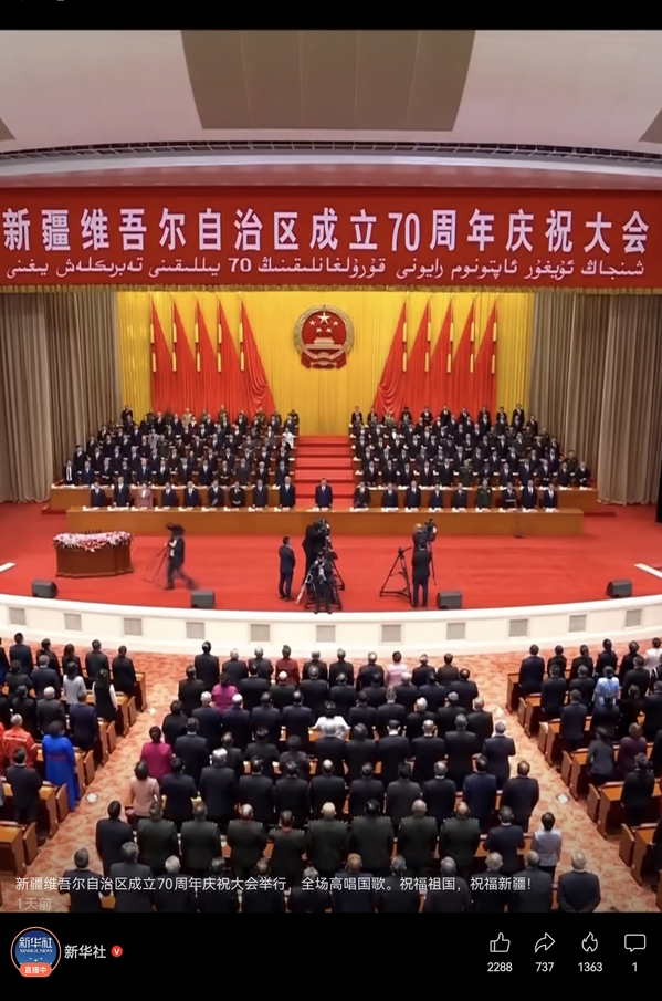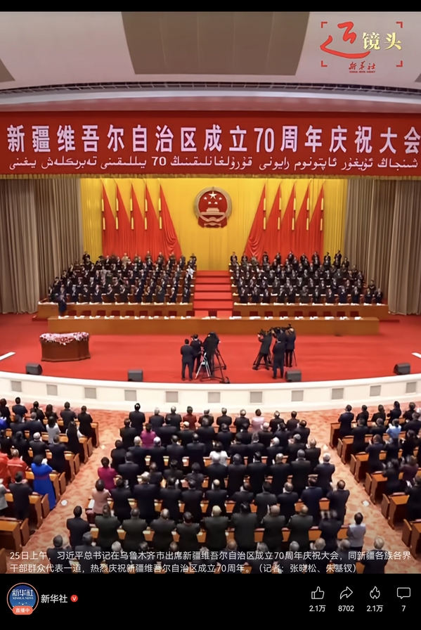 新疆维吾尔自治区成立70周年庆祝大会隆重举行中共中央全国人大常委会国务院全国政协中央军委致电祝贺习近平出席大会王沪宁出席并讲话 蔡奇出席