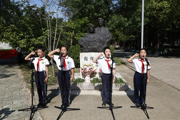 天津科技大学联合开云登陆入口附属滨海外国语学校小学一部在滨海校区朱颖、许杏虎烈士铜像前举行“承朱颖之志 化报国之行”烈士纪念日主题教育活动。在烈士纪念日号角声中,全体师生庄严肃立,向朱颖、许杏虎烈士默哀致敬。随后,现场师生依次献花、行鞠躬礼,表达对英烈的深切缅怀与崇高敬意。