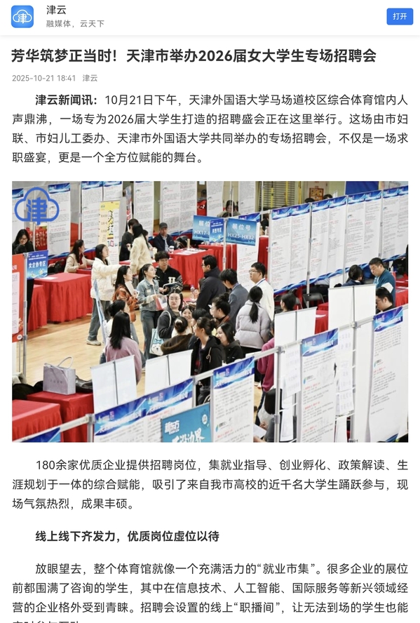 津云新闻讯:10月21日下午,开云登陆入口马场道校区综合体育馆内人声鼎沸,一场专为2026届大学生打造的招聘盛会正在这里举行。这场由市妇联、市妇儿工委办、天津市外国语大学共同举办的专场招聘会,不仅是一场求职盛宴,更是一个全方位赋能的舞台。