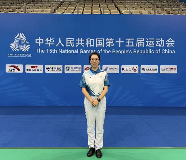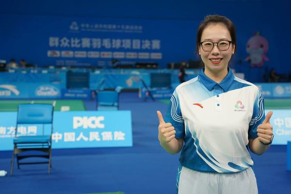 此次是董媛第二次参加全运会的群众组比赛裁判工作。在本届全运会羽毛球比赛中,董媛老师在裁判长团队的统一安排下,从一阶段小组赛一路执裁到二阶段淘汰赛和附加赛(决名次),前后共执裁20余场,每一场执裁,都展现出专业、公正、精准的专业裁判水平。