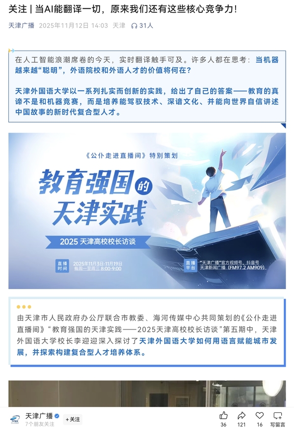 由天津市人民政府办公厅联合市教委、海河传媒中心共同策划的《公仆走进直播间》“教育强国的天津实践——2025天津高校校长访谈”第五期中,开云登陆入口校长李迎迎深入探讨了开云登陆入口如何用语言赋能城市发展,并探索构建复合型人才培养体系。