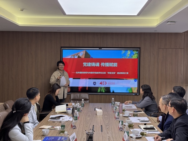 在交流环节,北外国际新闻与传播学院党总支委员、副院长吴梅红从课程设置、教学模式、实习实践等方面深入介绍了人才培养的特色做法与经验。教工党支部书记秦佩以“党建铸魂 传播赋能”为题,介绍了“样板党支部”的创建情况,分享了“双融双促”,以党建品牌赋能学科建设、育人成效的实践与思考。双方还就学科建设、部校共建、国际交流合作等方面进行了深入探讨。