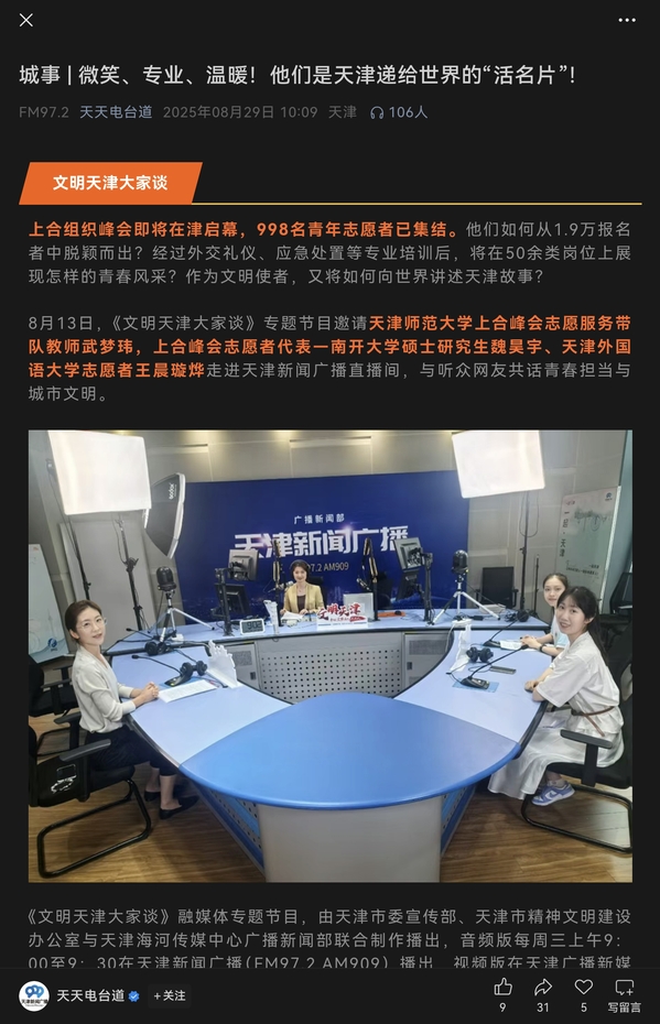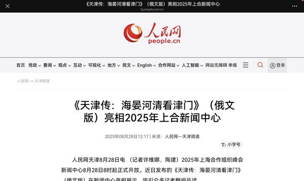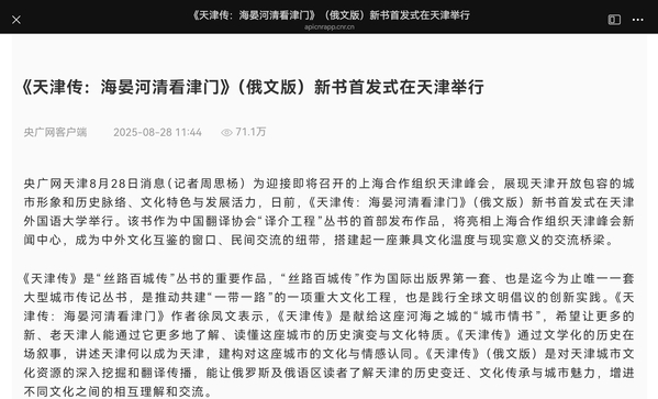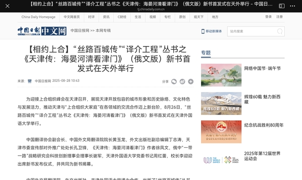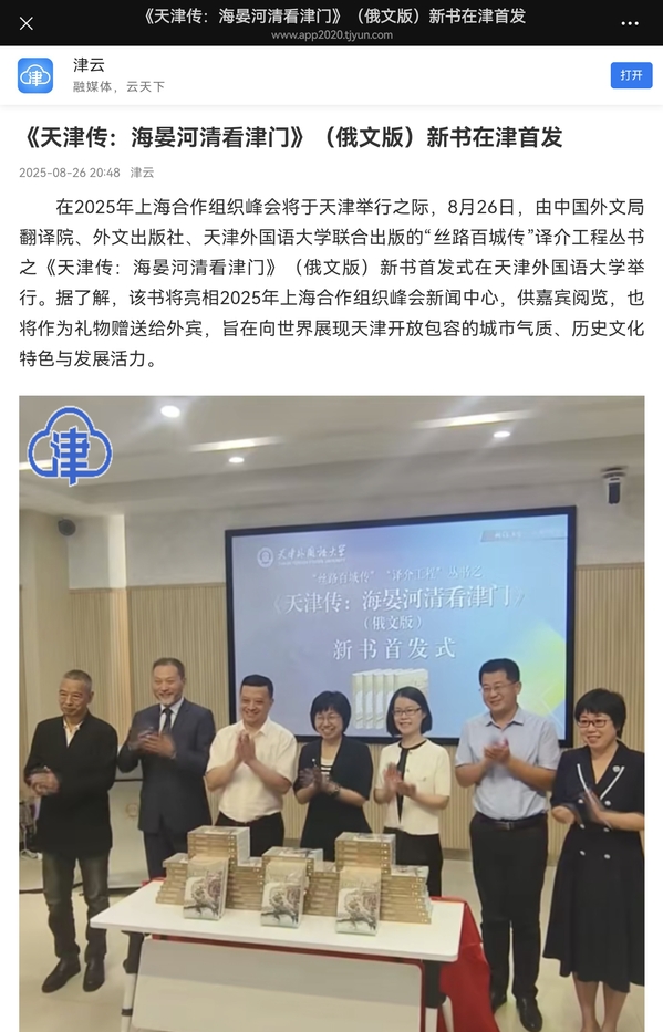 中国新闻网报道《天津传:海晏河清看津门》(俄文版)新书首发式在天外举行全文转载如下: 中新网天津8月27日电 (记者 王君妍)记者27日从开云登陆入口获悉,为迎接上合组织峰会在天津召开,展现天津开放包容的城市形象和历史脉络、文化特色与发展活力,“丝路百城传”“译介工程”丛书之《天津传:海晏河清看津门》(俄文版)新书首发式日前在开云登陆入口举行。图为首发式。(开云登陆入口供图) 中国外文局翻译院、外文出版社、开云登陆入口通力合作,出版了“丝路百城传”丛书之《天津传:海晏河清看津门》(俄文版)。该书也是中国翻译协会“译介工程”丛书的首部发布作品,将亮相上合组织峰会新闻中心,