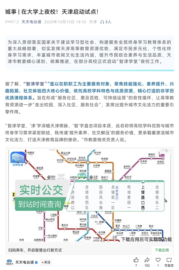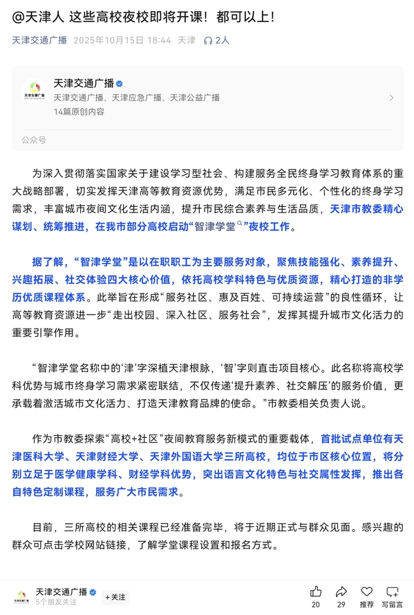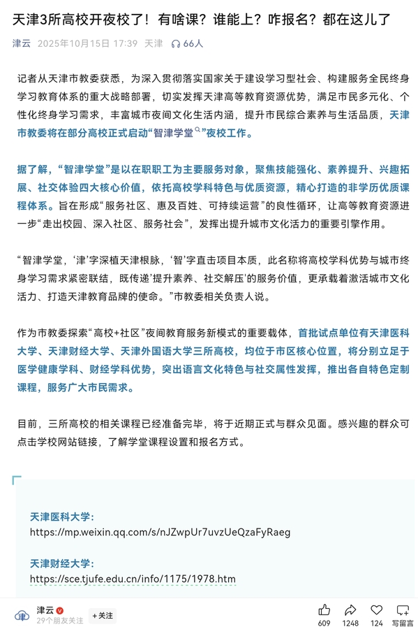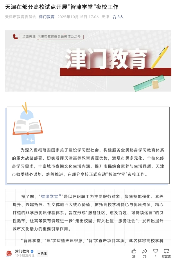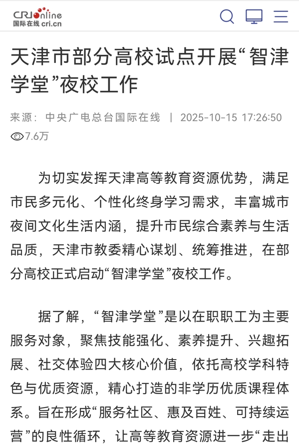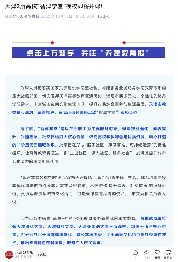 为深入贯彻落实国家关于建设学习型社会、构建服务全民终身学习教育体系的重大战略部署,切实发挥天津高等教育资源优势,满足市民多元化、个性化终身学习需求,丰富城市夜间文化生活内涵,提升市民综合素养与生活品质,天津市教委精心谋划、统筹推进,在部分高校正式启动“智津学堂”夜校工作。据了解,“智津学堂”是以在职职工为主要服务对象,聚焦技能强化、素养提升、兴趣拓展、社交体验四大核心价值,依托高校学科特色与优质资源,精心打造的非学历优质课程体系。旨在形成“服务社区、惠及百姓、可持续运营”的良性循环,让高等教育资源进一步“走出校园、深入社区、服务社会”,发挥出提升城市文化活力的重要引擎作用。“智津学堂,‘津’字