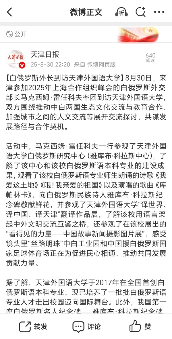 【相约上合】《天津日报》上合峰会专版、视频号、官方微博报道白俄罗斯外长到访我校